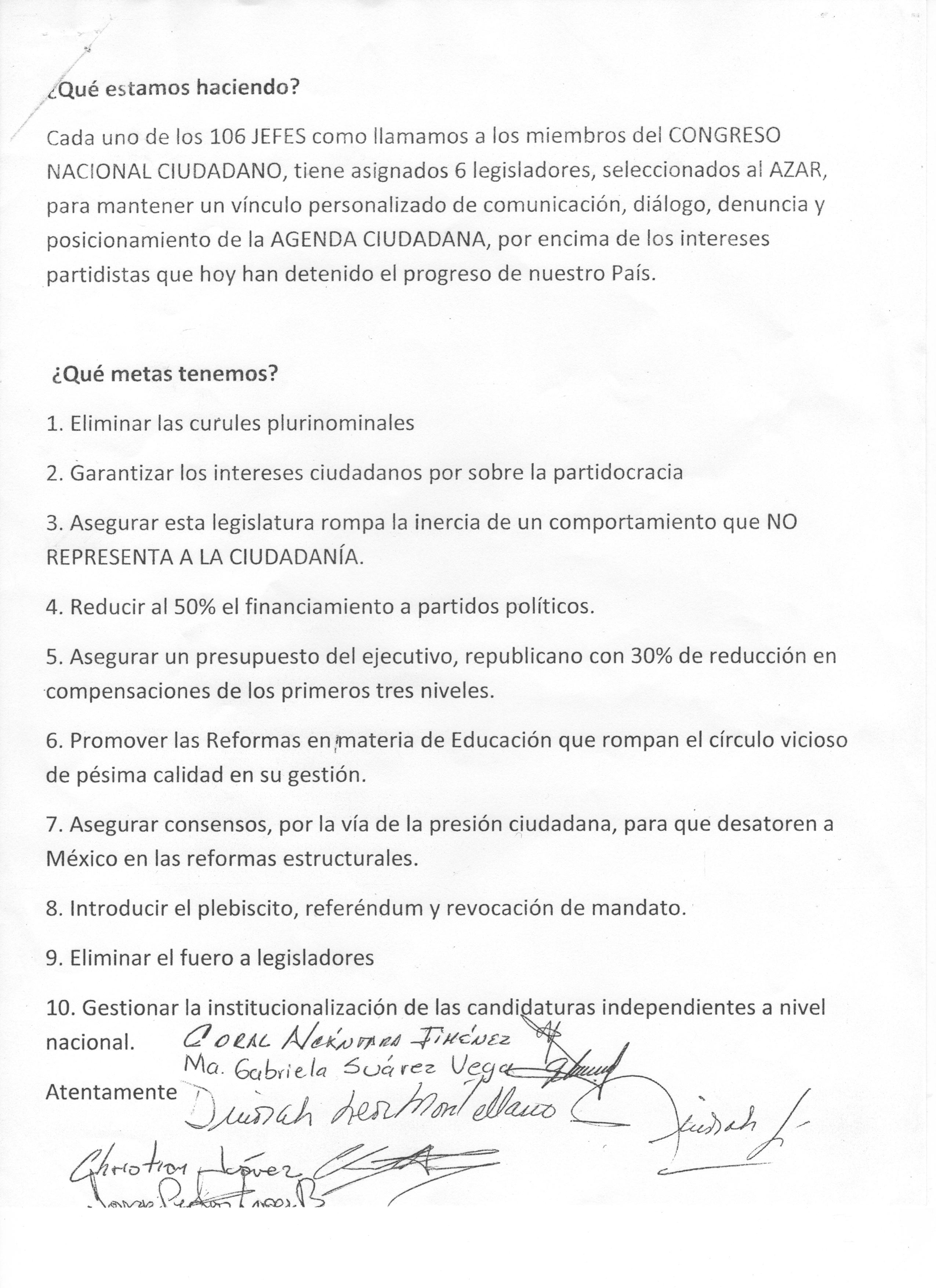 la siguiente exhortación que en calidad de MANDANTES, le hace el Congreso Nacional Ciudadano, fundamentado en el Art. 39