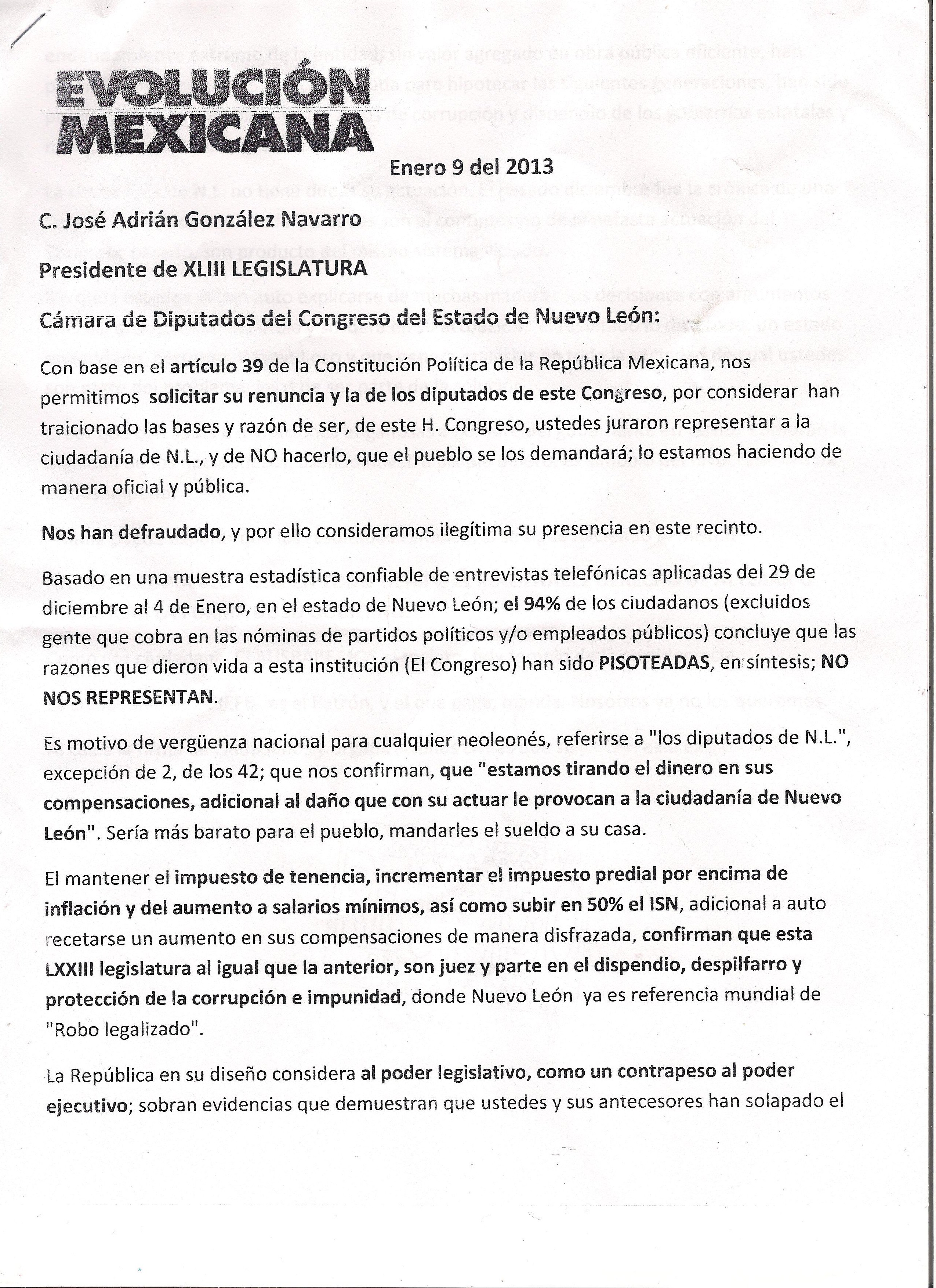 Clausuran Congreso del Estado de N.L. por traidores; Evolución Mexicana y otros colectivos enero 9 del 2013