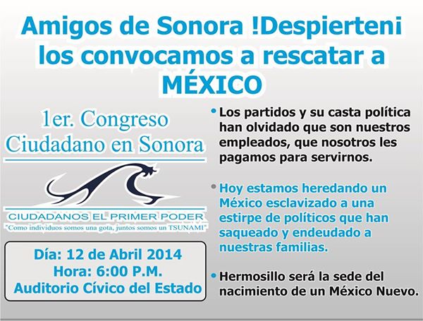 Voceros del Congreso Nacional Ciudadano estaremos en Hermosillo Sonora este sabado 12 de abril a las 6:00 pm en el Auditorio Cívico del Estado. Julián LeBarón, Pedro Novo y Gilberto Lozano nos haremos presentes en la cuna del México Nuevo, invitados por todos los ciudadanos sonorenses que han escapado de las cadenas de la partidocracia