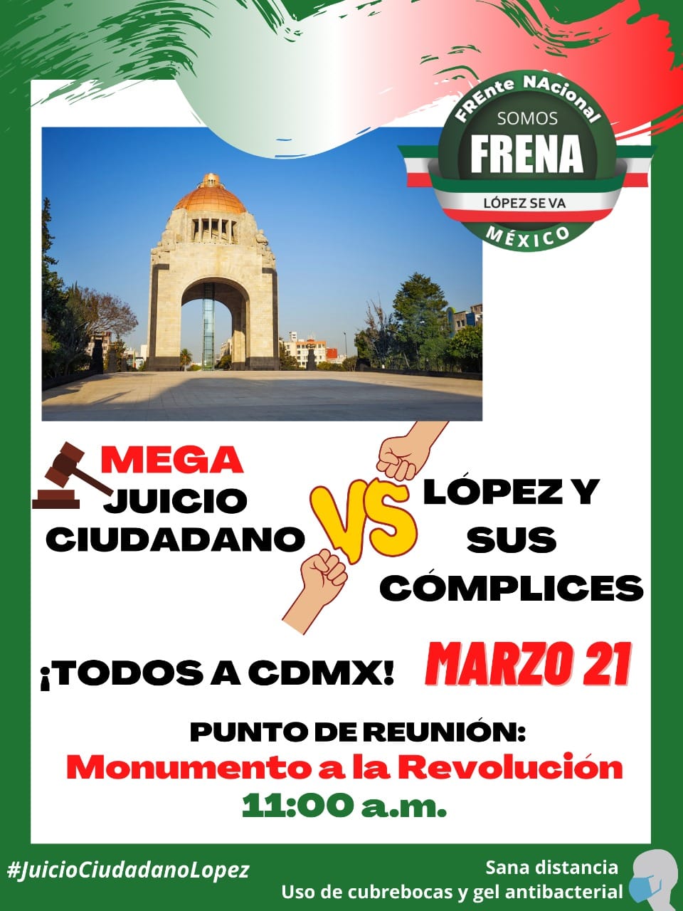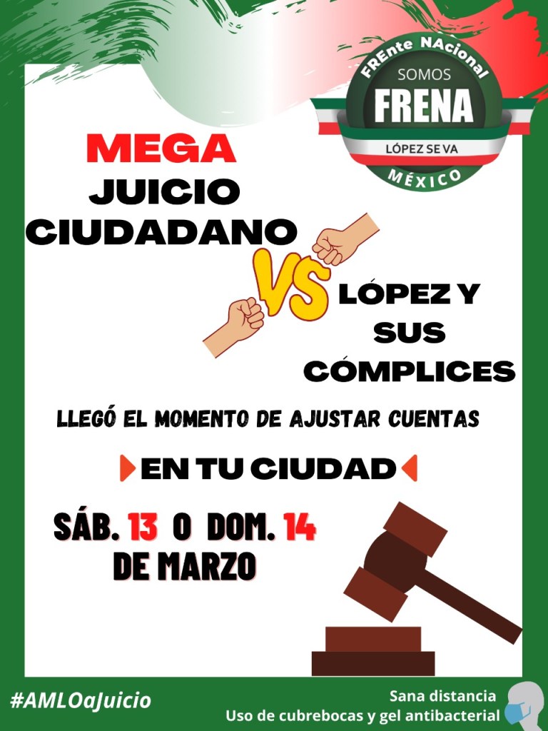 Donde haya mexicanos que estén indignados con la catástrofe que vive México, podrán hacer un Juicio Ciudadano contra AMLO y sus cómplices, en Marzo 13 o 14.