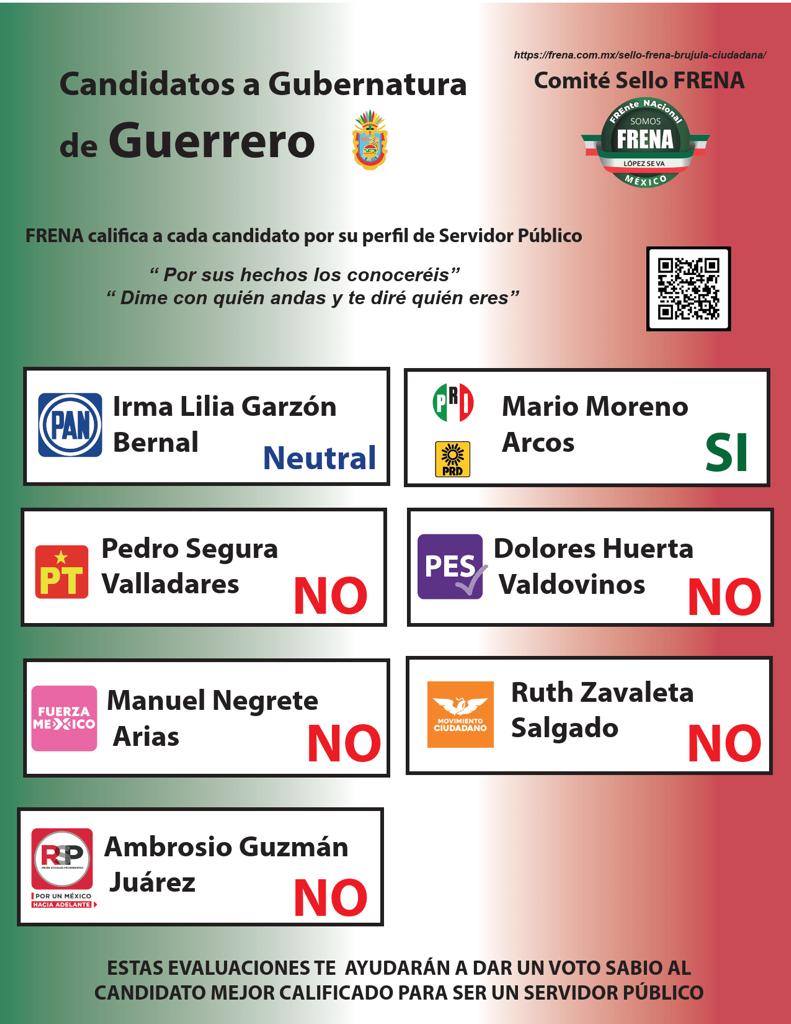 1. Muchas gracias por la información que aunque no estoy en Guerrero, me da mucho gusto, primero que NO aparece el violador y compadre del Kakas en los sellos y los felicito al Ing.G.Lozano y al grupo Frena, por esta labor, investigación, etc.que hacen de los candidatos, etc. Cuídense y que Dios los bendiga.👏👏👏👏