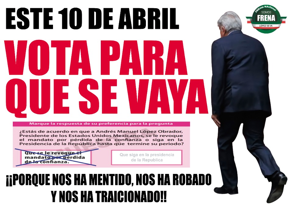 Mexicano, piensa en el verdadero México que deseamos la gran mayoría, y no en el remedo que López espera implementar. Exigimos un País que haga Grupo con los Líderes Mundiales y no con los mediocres que López pretende liderear y que le dan cuerda a su ego, erigiéndolo como líder, para seguir recibiendo dinero a costa del trabajo de los mexicanos. ¡¡ TODOS A REVOCAR A LÓPEZ EN ABRIL 10, PRÓXIMO !!.
