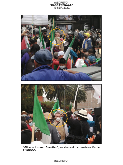 “Señor Presidente: Me permito informar a usted, que se ha identificado a un individuo con personalidad militar que ha participado en eventos masivos de la organización autodenominada Frente Nacional Anti AMLO (FRENAAA)”.