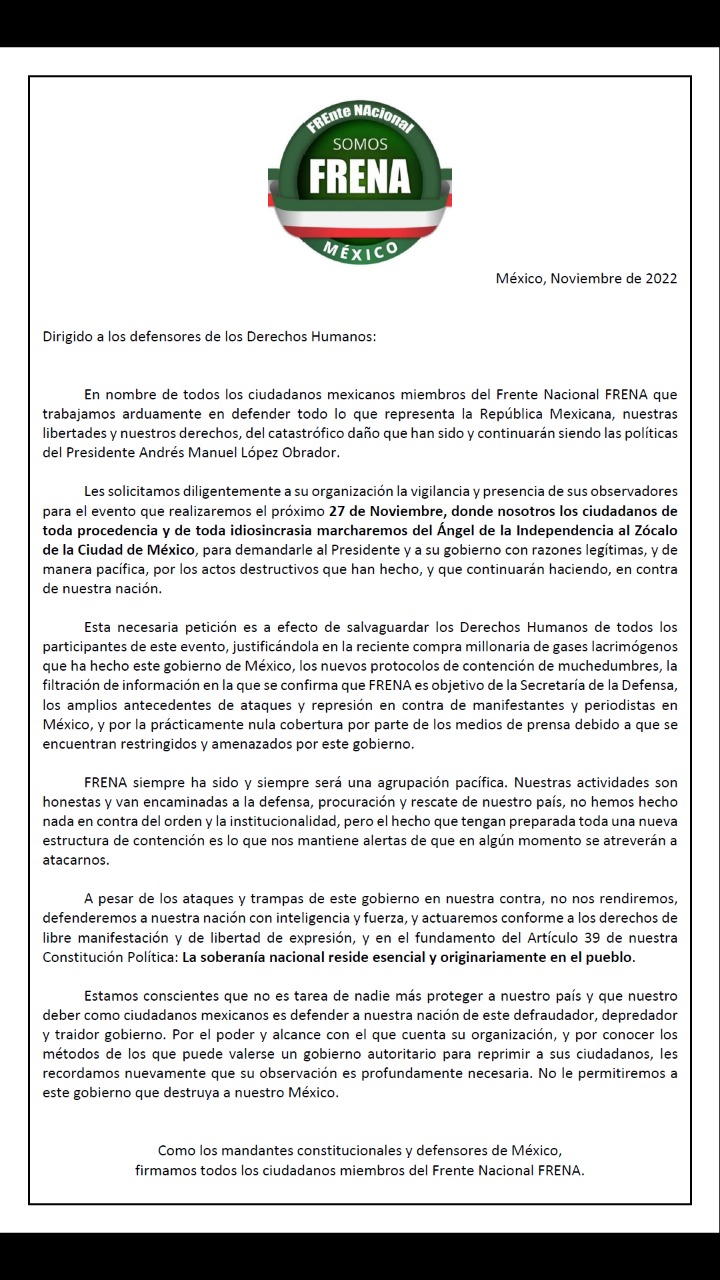 FRENA hace un llamado a todos los organismos internacionales de Derechos Humanos a OBSERVAR la #GranMarchaLiberación de México, de este 27 de Noviembre en la CdMx.
