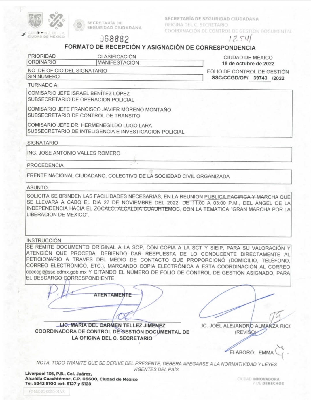 Aquí el permiso otorgardo desde OCTUBRE 18 para nuestra MARCHA por el Gobierno de la CdMx.