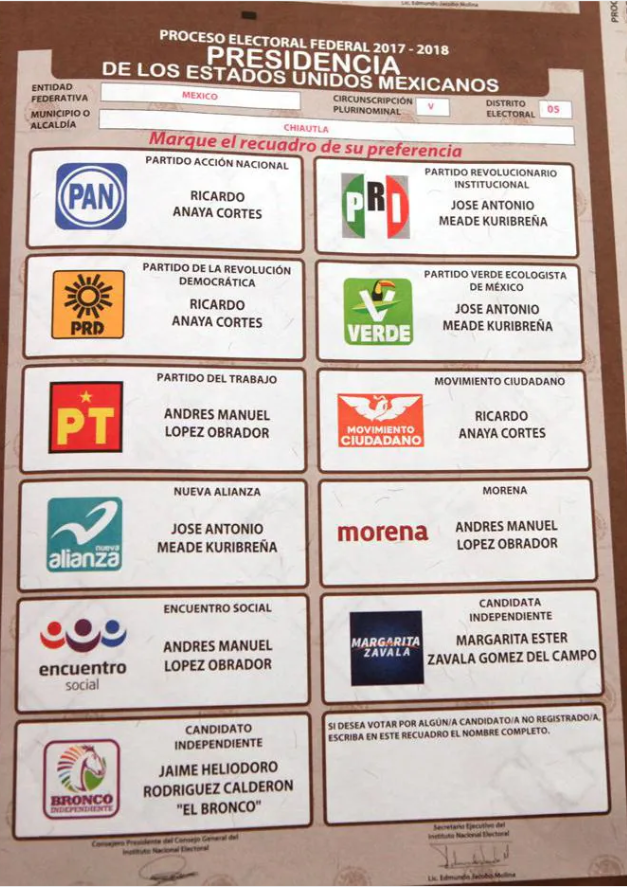USA RECUADRO DE CANDIDATO NO REGISTRADO y pon el nombre completo del mexicano o mexicana QUE TU EIGIRÍAS: (ejemplo de la boleta)